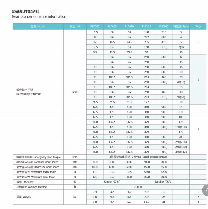 高精度行星減速器PLF系列可選型分別有:60、80、90、120、160